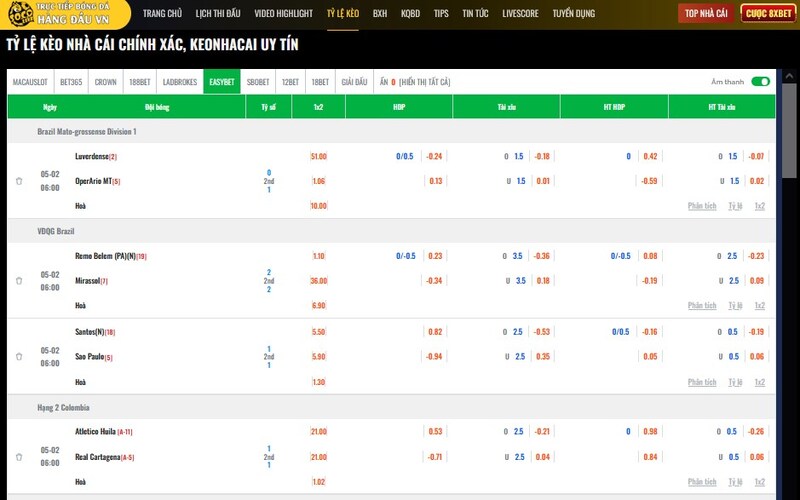 Nếu anh em quan tâm đến cá cược thì chắc chắn sẽ rất thích mục tỷ lệ kèo tại Socolive.TV. Trang web cập nhật dữ liệu từ nhiều nhà cái lớn, hiển thị đủ các loại kèo phổ biến: châu Á, châu Âu, tài xỉu, phạt góc, kèo rung…